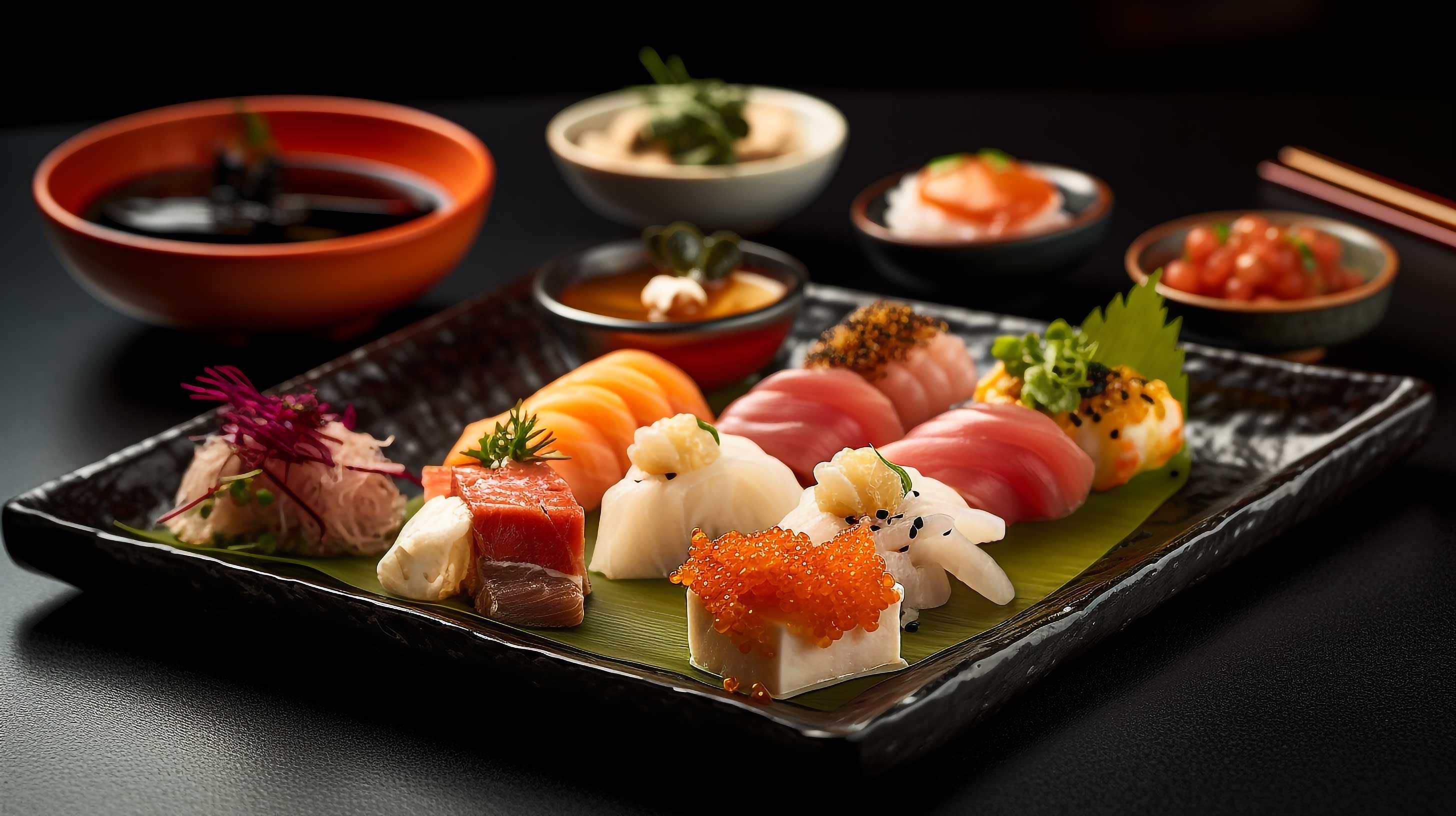 鮪、羽太、牡丹海老、芽物彩々、山葵
